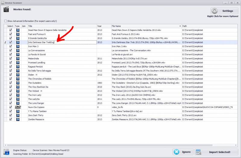 When the scan is finished you will have the list of all movies found. The grid is editable, so you can adjust Titles before save everything on the database.