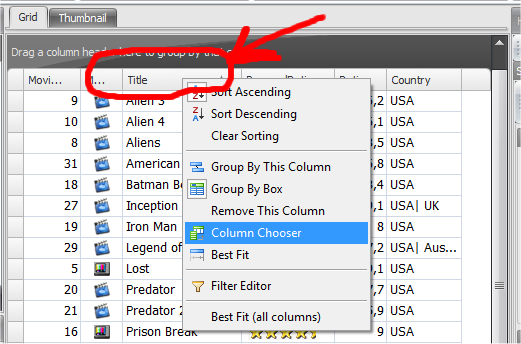 As you can see you have many options. One of this is the “Column Chooser”, that let you Drag & Drop Columns to your grid: