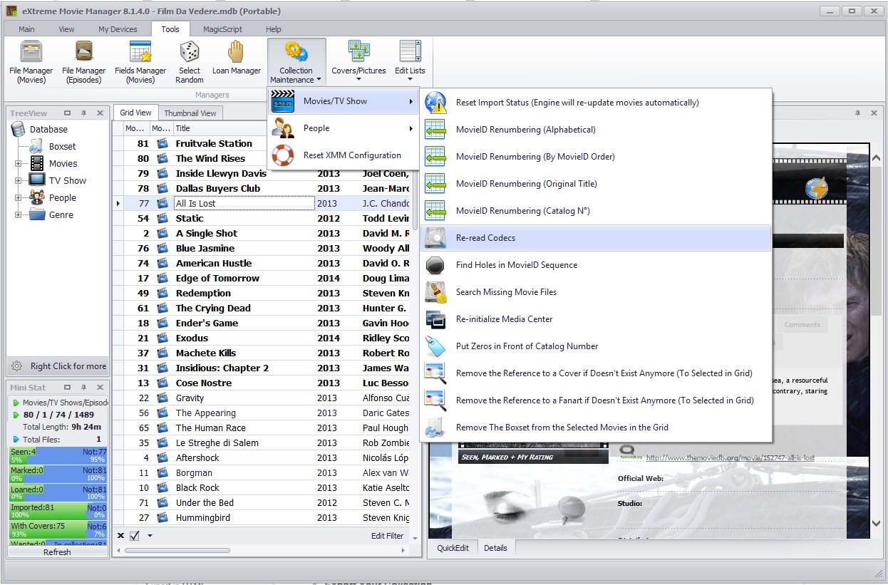 If you need to re-read the movie codecs and information (because you have skip during Hard Disk Scan or simply you want update it) just select all movies you want from the main Grid and then Go in the “Tools” - > “Collection Maintenance” → “Re-Read Codec”