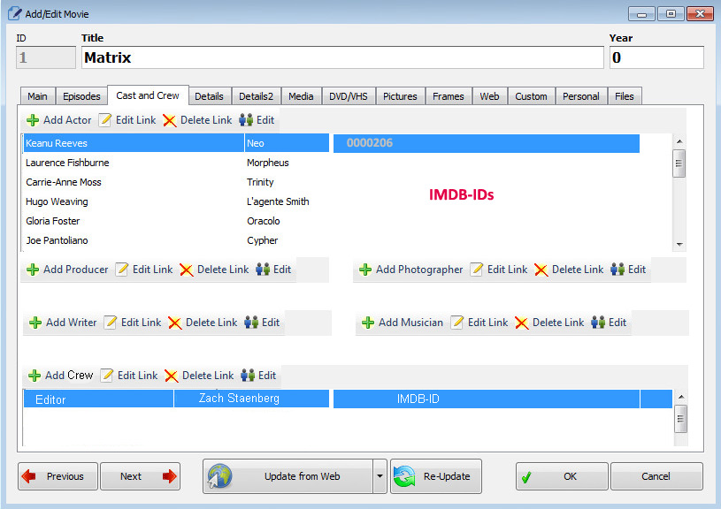 2. Cast&Crew (important: IMDB ID, data field also necessary in person database). Editor field can be cancelled, all other crew members get their own table