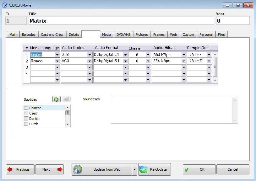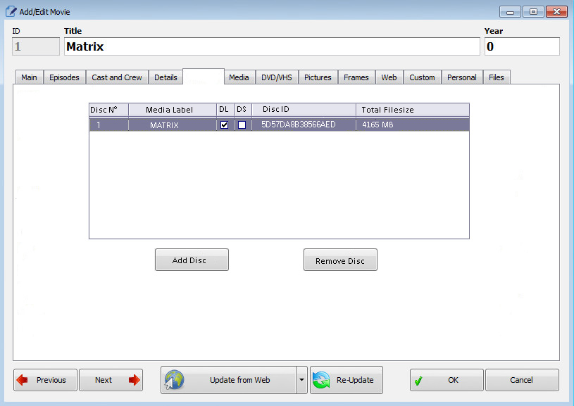 3. Multiple disk support can be put together with the files in the corresponding tab. At the moment no multi-disc support is available (box-set is bad für special edions with bonus DVD). And data fields like Disc N°, Media Label, Dual-Layer (DL), Double-Sided (DS), Filesize (here xMM should detect the whole disc size and not the size of single files) and as a new field Disc ID (unique value, important for commercial DVD). Table can be deactivated when movie is on harddisk.